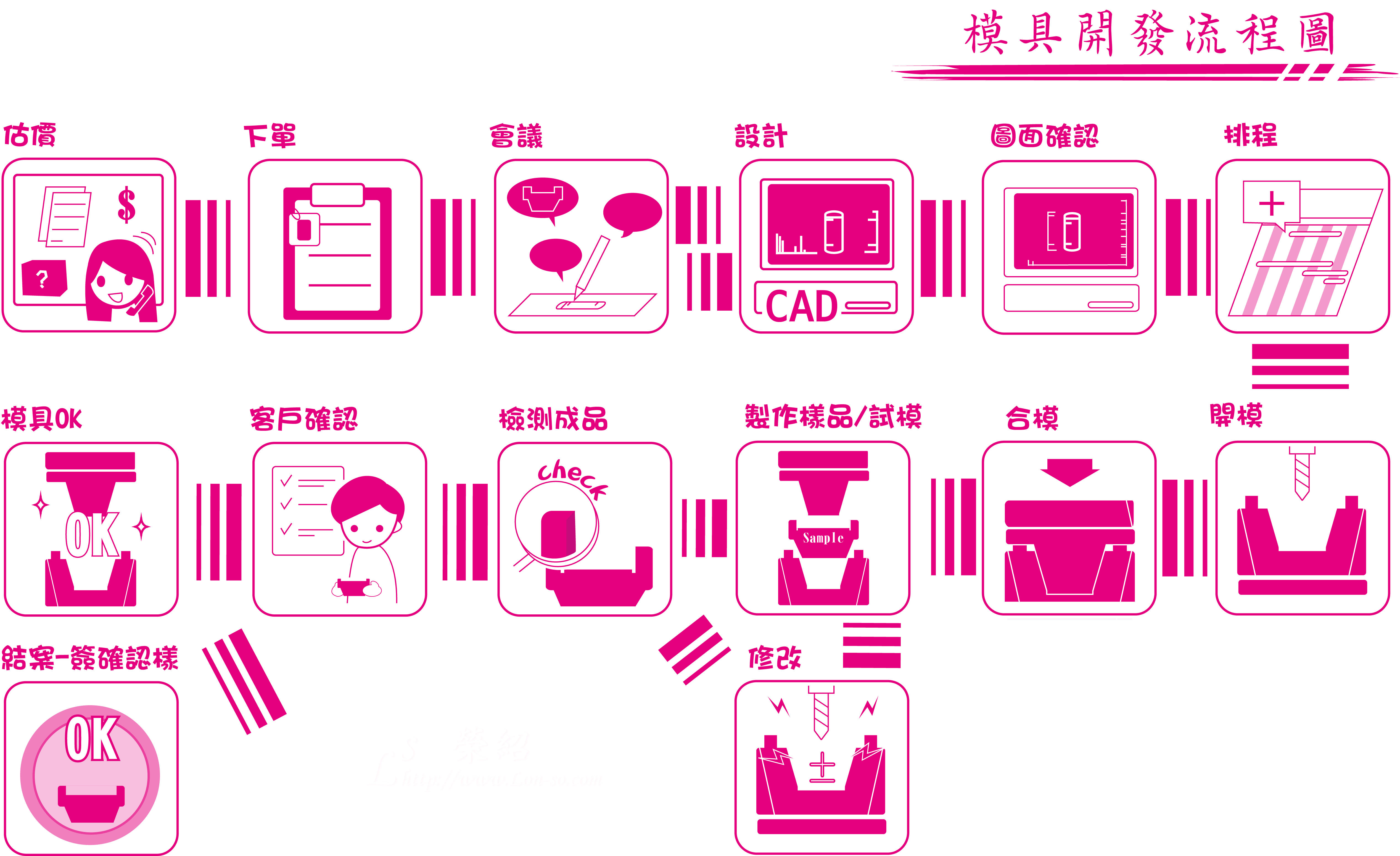 3. 「設計」、「開模」、「射出」、「加工」一應俱全。